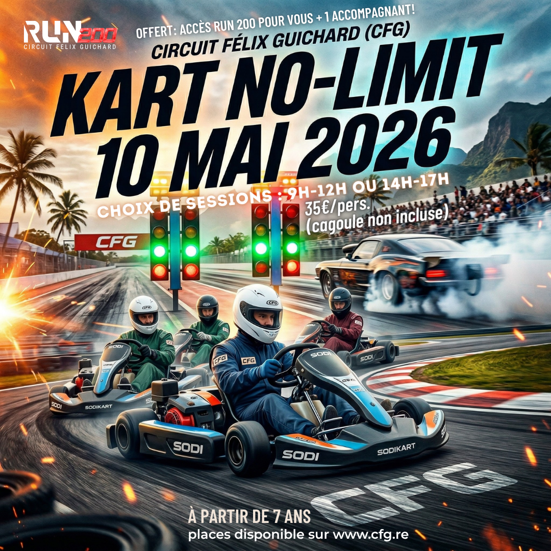 🎁 VOTRE BONUS EXCLUSIF : Accès OFFERT au Maxi Show RUN 200 ! En achetant ta place Kart No-Limit, tu débloques instantanément ton accès gratuit (pour TOI + 1 accompagnant) au plus grand show d’accélération de l’île qui se déroule en simultané sur le grand circuit ! 👀 Duels de dragsters sur 200m ✨ Exposition auto d’exception 🎧 Ambiance assurée par notre DJ