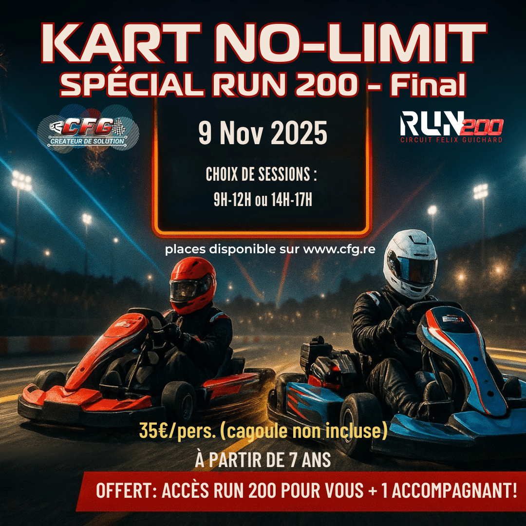 Découvrez notre événement Kart No-Limit CFG phare au Complexe Félix Guichard (CFG) ! Le dimanche 05 Octobre , choisissez votre session (9h-12h ou 14h-17h) pour une immersion totale dans l’univers du karting. Cette édition spéciale RUN 200 combine course effrénée et spectacle automobile dans un package unique à seulement 35€ par personne.